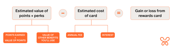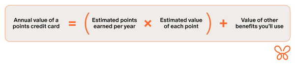 Annual value of a points credit card = (Estimated points earned per year * Estimated value of each point) + Value of other benefits you’ll use