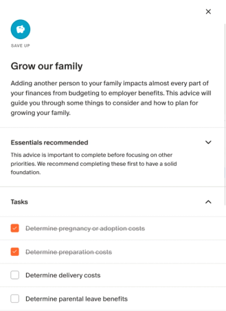 Monarch Pro Tip: If you’re not sure where to start, Monarch can guide you through the financial steps to having a baby. Monarch offers customized advice for growing your family under the advice tab, with goals, checklists, and guidance on what to tackle next.