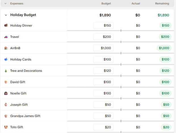As you create your holiday budget group, you can set the amount you’re budgeting overall for the season, and then set individual limits for each category.