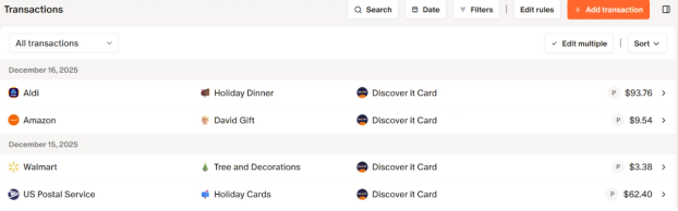 While using a holiday budgeting calculator or planner can help you figure out some rough numbers, when it comes time to finalize your budget, you’ll want a way to track your expenses and transactions in real time so you can stay on top of your spending categories. More on this later.