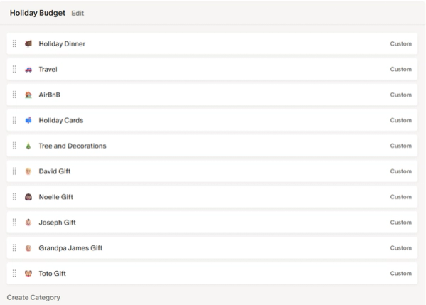 After you’ve created your Holiday Budget group, you can then add new categories based on your typical holiday expenses, like travel, groceries, and gifts for individual people.