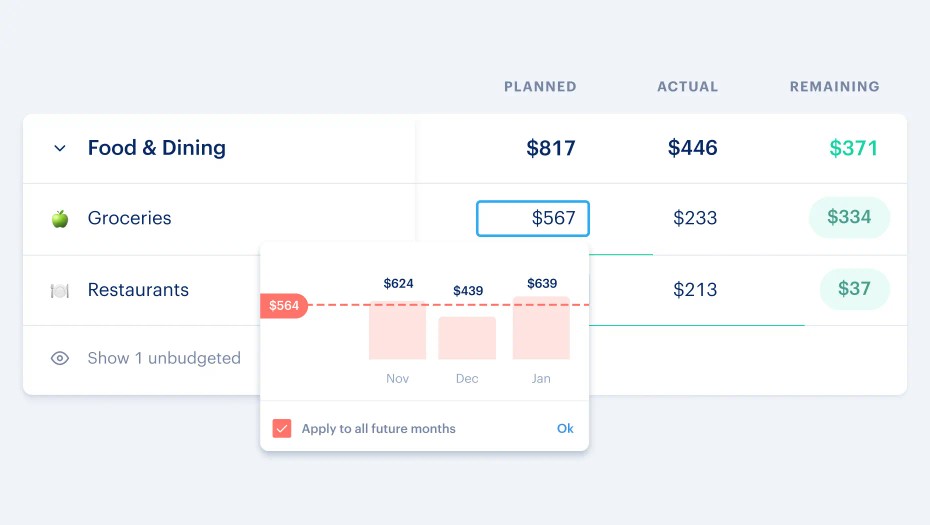 When trying to decide how much to set for a budget, Monarch will make an estimate using an average from the last 3 months in that category. This is particularly helpful if you click the budget amount each month to see if your 3 month average is trending up or down. The bar graph and ability to fill the budget amount is one of the most popular budget features in Monarch since it doesn’t force you to do calculations or estimations for your budget. 1 click will let you set a budget based on the average from the last 3 months.