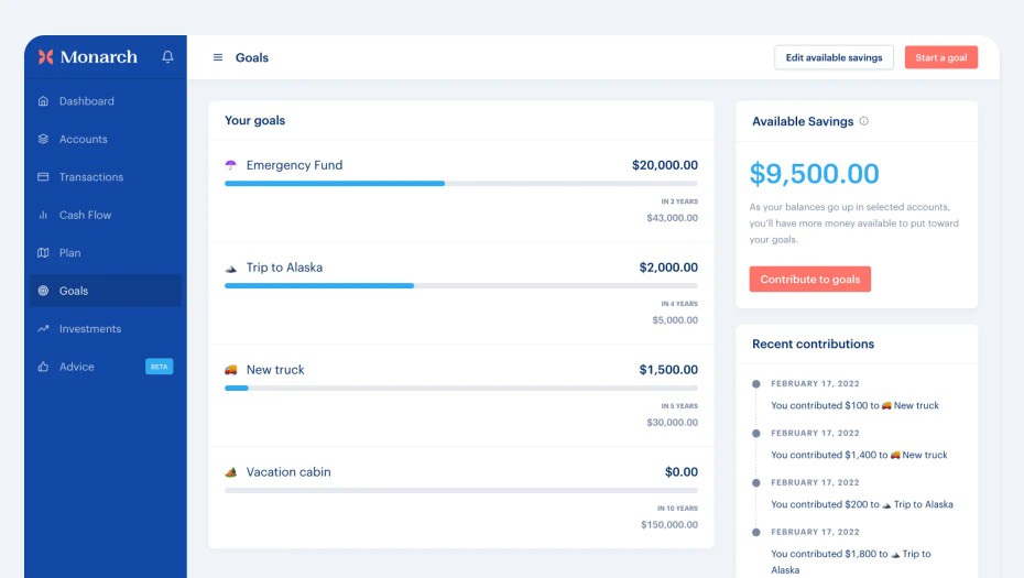Monarch also includes advice on what goals you might want to have. There are some common ones like saving for a down payment on a home, setting up an emergency fund, or just general open ended savings. We’re still early in our plans for building advice and planning to help with goals so expect to see more here in the future.