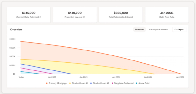If you have multiple debts, you can use Monarch’s debt dashboard to get a bird’s-eye view of your total debt, how much you have left to pay, how much interest you’re projected to pay, and your debt-free date.