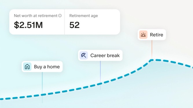 Model life events on a timeline. The big decisions—buying a home, having a kid, retiring, taking a career break—all have longer-term impact that are hard to model in your head. In Forecasting, you can add these events directly to your timeline and watch your projection update in real time. Want to see what happens if you retire at 58 instead of 65? Drag the event and find out. Thinking about a home purchase in three years? Add it and see how it changes your trajectory.