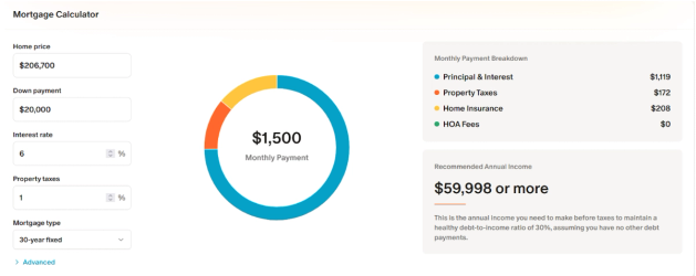 From there, we can look at how much house you can afford. Assuming you have no other debts, and with an interest rate of 6%, taxes at 1% yearly of the house value, and insurance at $2,500 a year, you can afford a home up to $206,700. You can use a mortgage calculator to fiddle with the numbers and see exactly how much you can afford based on your income.