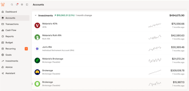 Monarch allows you to connect retirement accounts across different brokerages and administrators, giving you a holistic view of your savings instead of having to juggle multiple account logins. Monarch logs month-over month changes, showing you how your investments grow over time and allowing you to track your contributions.