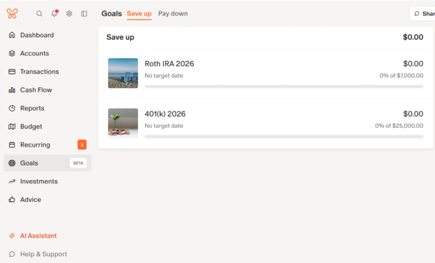 Finally, Monarch offers goal tracking, which allows you to set your retirement contribution goals and track them based on your contributions and automatic deductions from your paycheck. This way, you can watch your progress to maxing out each account and make sure you don’t go over the limit.