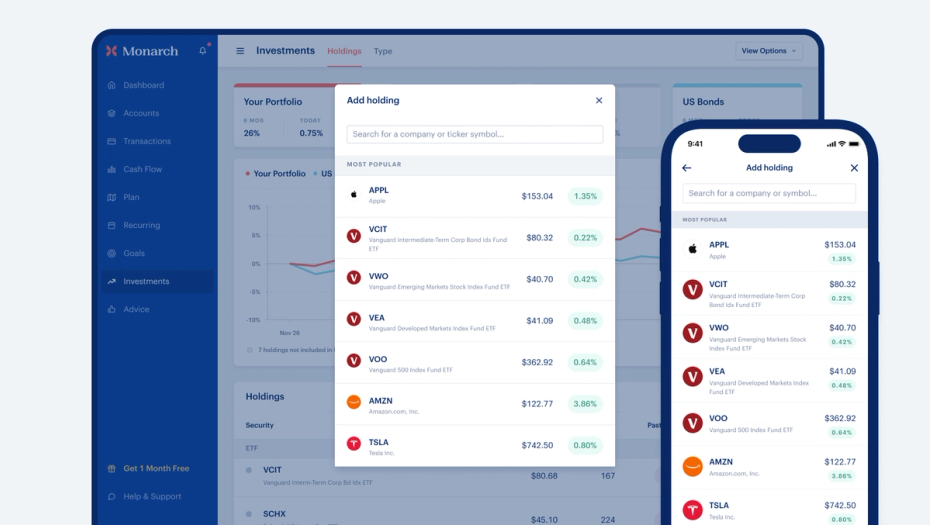 Monarch tracks the price of 20,000 publicly traded companies and ticker symbols. You can now create a manual investment account and enter the shares you own so that your personal portfolio value can be tracked over time. This works similar to how you can already connect an investment account and track things automatically but you can now track a portfolio without entering a user name and password for the investment account. It also works if you need to fix incorrect data your investment company might be sending to Monarch or just track an account that doesn’t allow Monarch to connect to it yet.