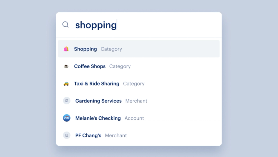 We are excited to launch global search which can be found anywhere in the web app up in the top left corner. This new search engine lets you quickly lookup any of your financial data, whether it’s specific things like a particular merchant or category, or more general info like an account or savings goal. You can also launch the new search using the keyboard shortcut cmd/ctl-K.