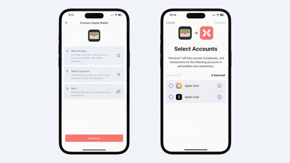 We’re very excited to be one of the first personal finance apps to offer full Apple Card support with the launch of iOS 17.4! Monarch can now sync directly with your Apple Wallet on iOS devices, and pull in your transactions and balance history with Apple Card, Apple Cash, and Savings from Apple Card automatically. We are currently rolling out access to this feature. To gain access, you’ll need to upgrade to iOS 17.4 on your device and download the latest version of Monarch (1.0.190).