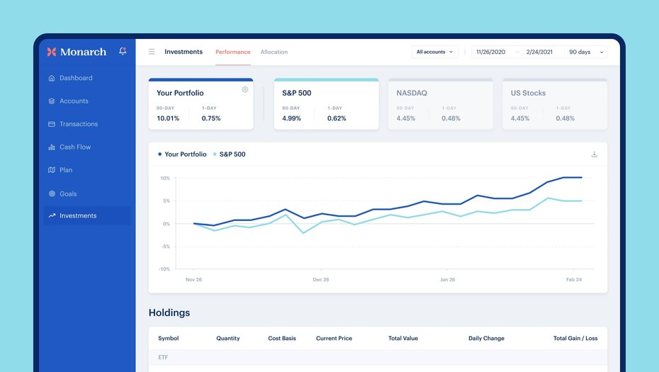 You can now track all of your investments in one place in the Monarch web app! Track all of your holdings across your investment accounts in one beautiful interface.