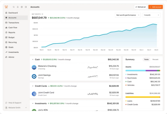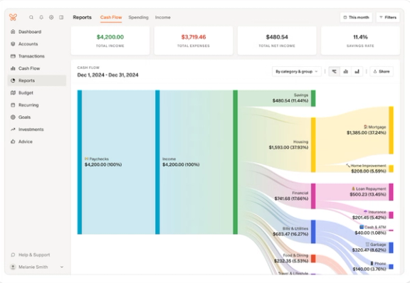 If you need to adjust a category, you can edit your budget any time from anywhere. For big-picture analysis, Monarch offers monthly reports and cashflow at a glance to keep you informed about how much you’re saving each month, and where your money is going. You can also project your cashflow and expenditures into the next month, allowing you to plan ahead.