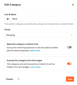 If you don’t want to use a default category, you can remove it from your budget by clicking on the gear next to the name.