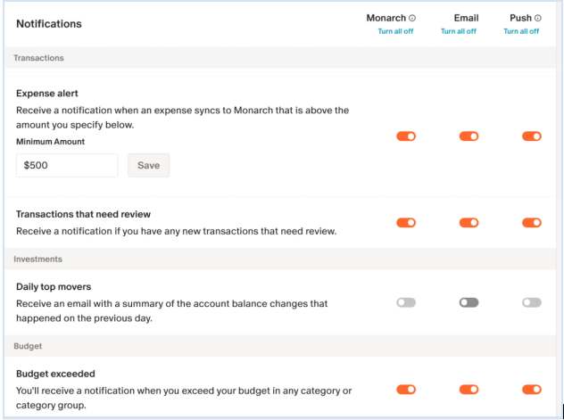 You can add custom alerts and notifications for when you exceed your budget, or when a transaction goes above a certain threshold, in the main settings option to the top left under “Notifications.”